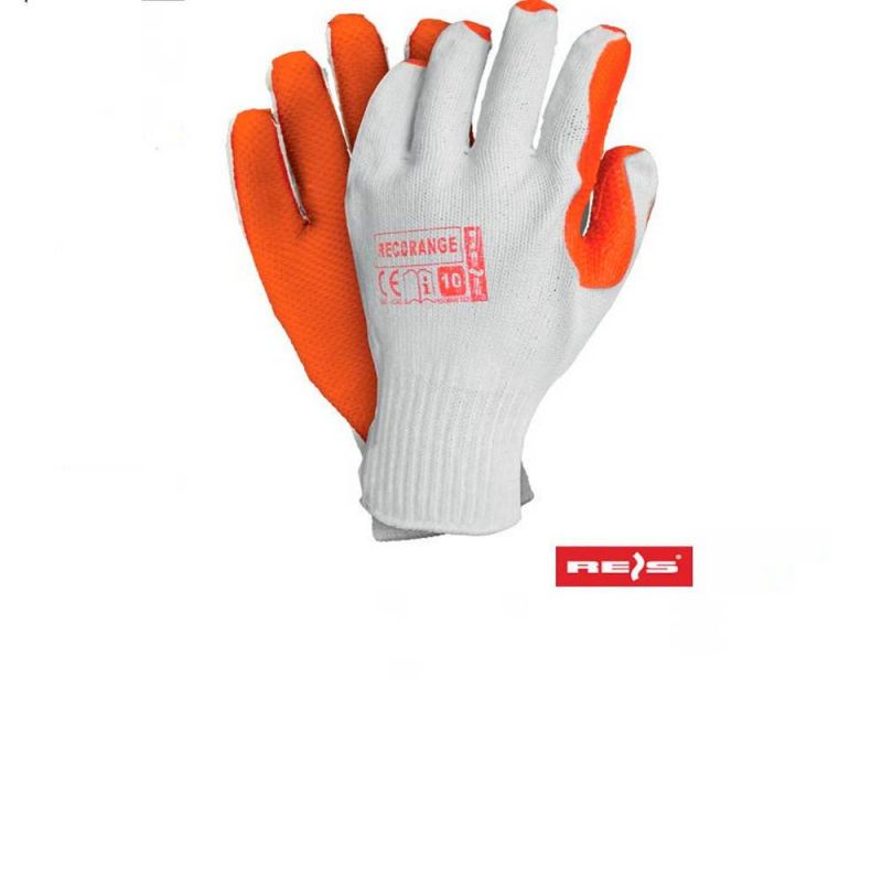 Рабочие перчатки не полный облив, используются в сфере строительства и транспортной промышленности, ладони и пальцы покрыты антискользящим средством из оранжевой вулканизированной резины. Трикотажный гипоаллергенный материал не вызывает раздражение кожи и аллергических реакций, перчатки приятно носить на руке. Надежный производитель REIS (Польша) предоставляет только высококачественные изделия.